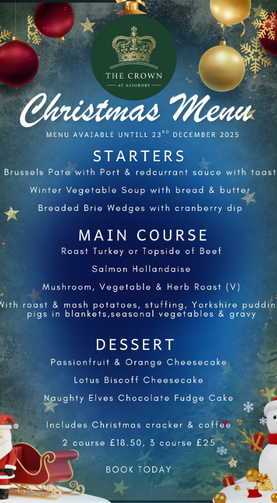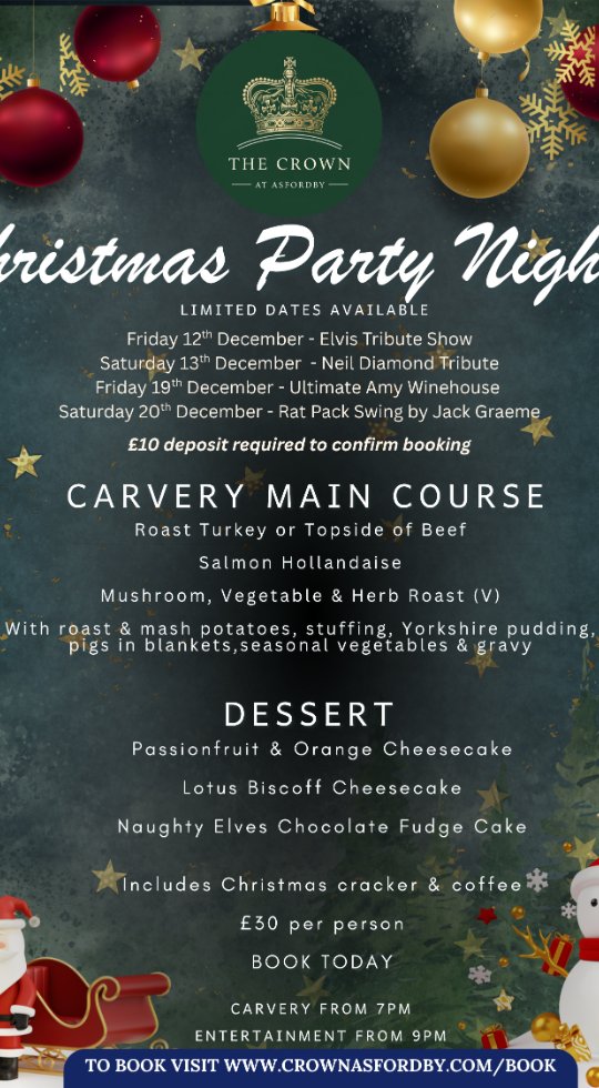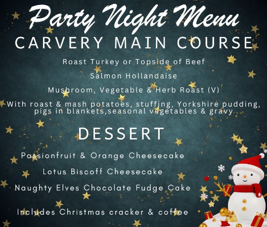 £30 per head. Perfect for all pre Christmas get togethers. What's included? MAINS Roast Turkey Roast Topside of Beef Salmon Hollandaise Mushroom, Vegetable & Herb Roast (V) With roast & mash potatoes, stuffing, Yorkshire pudding, pigs in blankets, seasonal vegetables & gravy DESSERTS Passionfruit & Orange Cheesecake Lotus Biscoff Cheesecake Naughty Elves Chocolate Fudge Cake PLEASE INFORM US OF ANY DIETARY REQUIREMENTS TO BOOK CLICK HERE TO BOOK CLICK HERE